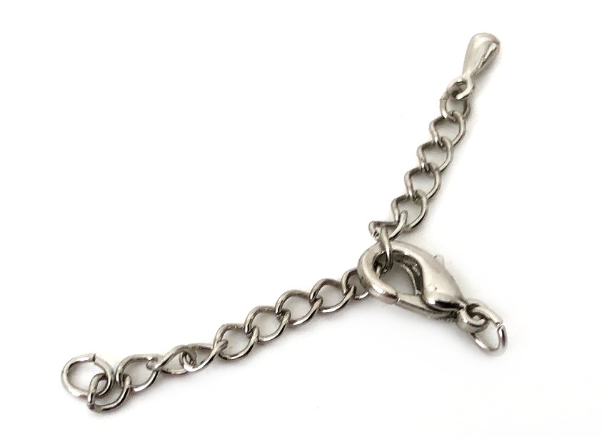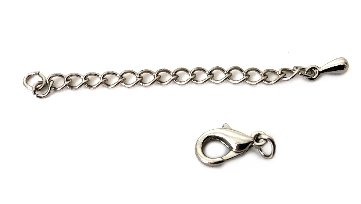 Platin coloured lobster claw clasp 12 mm with eyelet and an extender chain with a length of 5 cm. This closure can be used to mount end caps or attach steel rope directly to it with crushed beads.
