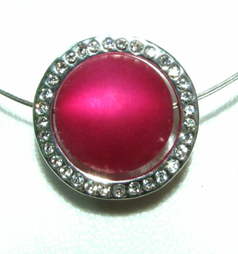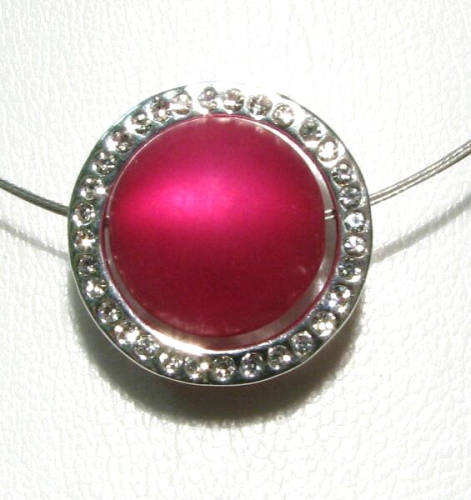 The silver plated pendant is set with about 32 clearly sparkling crystal stones all around. It has a size of approx.24.5 m and an inner dimension of approx.18.3mm. It has holes all around and can be used very variablely. The holes have a size of approx.2.2mm. It fits our steel rope colliers with plug-in closure up to 7 rows. In the middle of the pendant you can put a bead up to a size of 18 mm and pull it through the necklace (see model photo: Steel rope collier 3-row + 18 mm polaris bead with small hole)