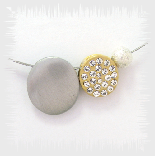 This rhodium plated, slightly oval, downward slanted element has a size of approx.16.2x14.6 mm and a hole size of approx.1.8 mm. This makes it suitable for our steel rope colliers with plug-in closure up to 3 rows. This element is very versatile. On the model photos you can see a combination with the creative pendant crystal plate and a diamond 6 mm bead, as well as a combination with our creative pendant “disk”. This special offer is the individually depicted rhodium-plated element. All other parts can be ordered separately.