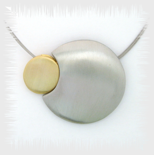 This gold-plated, slightly oval, bevelled down element has a size of approx.16.2x14.6 mm and a hole size of approx.1.8 mm. This makes it suitable for our steel rope colliers with plug-in closure up to 3 rows. This element is very versatile. On the model photos you can see a combination with the creative pendant 3/4 moon rhodium plated, as well as a combination with our creative pendant “Scheibe”. This special offer is the individually illustrated, gilded element. All other parts can be ordered separately.
