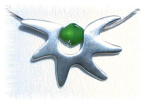 Pendant silver plated. The pendant has a size of approx.35mmx25 mm and a hole size of approx.3,8mm. It fits our steel rope colliers with plug-in closure up to 7 rows and our 2 mm rubber colliers with click closure. In the middle of the pendant you can put a 8-10 mm bead and pull it through the necklace (see model photo) This is only the pendant. The necklace and beads (a.o.8 mm Polaris double cone or 10 mm Polaris round bead) can also be found in our shop.